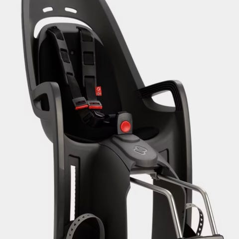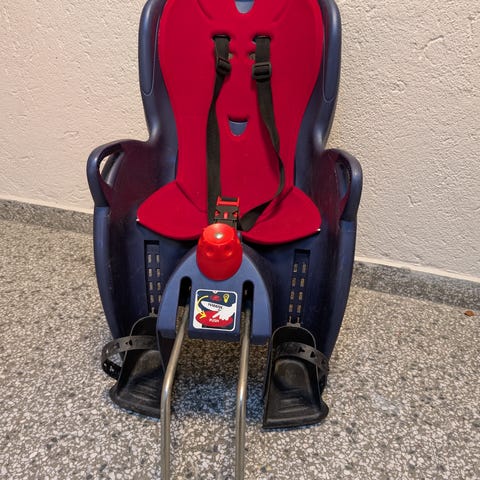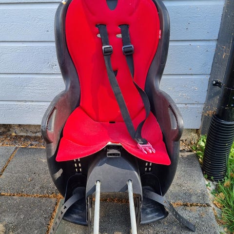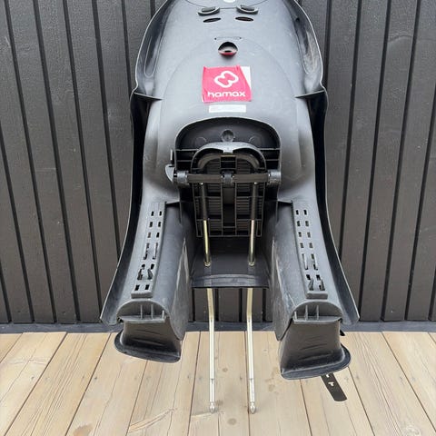 Hamax sykkelsete for barn i svart farge. Designet for montering på sykkelramme med sikkerhetsbelte og fotstøtter. Laget av slitesterkt materiale for trygg transport av barn under sykling.