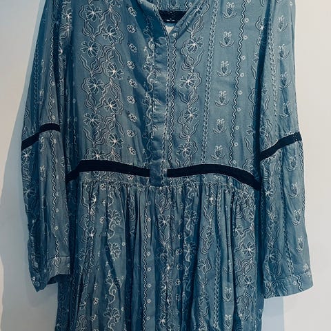 Part Two sommerkjole i grå/blå farge, størrelse 34. Kjolen har broderte detaljer på ermer og bryst, med en løs og ledig passform.