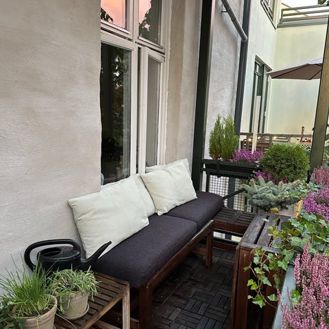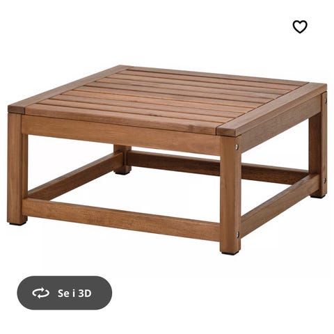 Utemøbelsett fra IKEA i tre som inkluderer hjørnesofa med grønne og grå puter og et matchende bord. Følger også med et grill/tran her ord. Settet består av flere moduler som kan arrangeres i en L-form, og bordet har en enkel, rektangulær design. Passer for utendørs bruk på balkong eller terrasse. Putetrekkene kan tas av for vask. Følger også med svarte trekk til sitteputene. Andre farger kan kjøpes på IKEA.