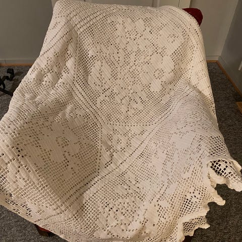 Passer til dobbeltseng. Min bestemor hekla det i sin tid. Eg har desverre ikkje plass lenger. 2,35x 2,16 ca