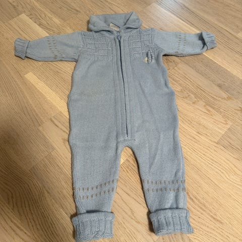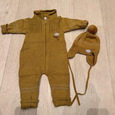 Sparkedress str. 68. Lue str. 40-42, noe slitt/ødelagt på tråen. Tøfler str. 74-80
