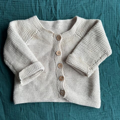Strikka i Knitting for Olives merino i fargen kitt(kvit med gråskjær). Treknappar.