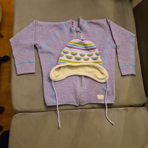 WoolLand Barn Rosa ullundertøy sett i størrelse 122 for jente. Sett består av genser og bukse i rosa farge, laget i ullmateriale. Genseren har en elgdetalj foran, og buksen har hjerteformer på knærne. Plagget har elastiske mansjetter og lommer med rysjedetaljer. Fikk noen små hull foran på leggen da buksen var ny. De er sydd og har ikke «bevegd» seg. Det er også noen få flekker på genseren. Har ikke prøvd å fjerne de. Se bilde. Setter er veldig lite brukt, da det var brukt mest til best. Selges 600 kr.