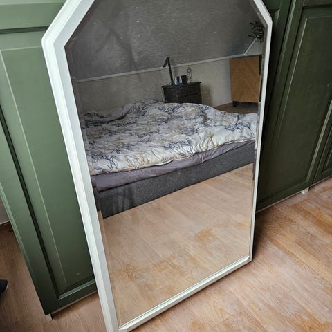 Speil i treramme / furu. Maleri av Gerd Andersen 1990 i toppen av speilet. Mål speil; 27x41cm, Mål rammen; 45x85cm. I god stand.