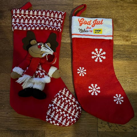 2 stykk helt nye ubrukte, strikkede julestrømper. Store og gode.