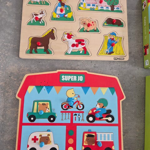 Selger et sett med fargerike trepuslespill for barn med motiver av dyr, kjøretøy og figurer.