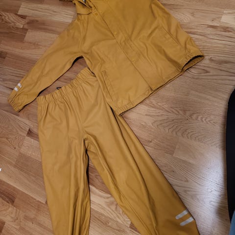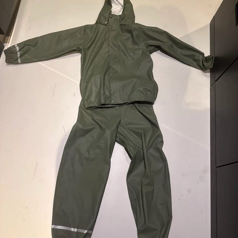 Name it regntøy for barn i størrelse 122, grønn farge, unisex design. Settet består av jakke med hette og bukse med elastisk midje. Materialet er vanntett og egnet for bruk i vått vær.