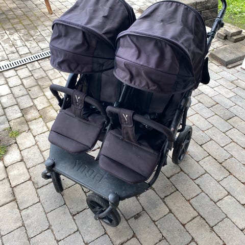 Vogn selges da vi ikke har bruk for den lenger. Det er byttet ryggplater på begge sider. Kan legges helt ned om barna vil sove. Slitasje på styret, se bildet som er vedlagt! Kan lett slås sammen og tar da betydelig mindre plass for oppbevaring eller i bagasjerom på bil. God plass bak for oppbevaring. God å trille på alle underlag! Må hentes.