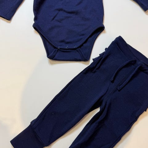 Mørkeblå med lyseblå detaljer/elg på rygg.