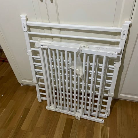 Jollyroom Barnesikringsgrind laget av svart metall. Designet for å sikre barn i hjemmet ved å blokkere tilgang til trapper eller andre områder. Enkel å montere og justere i bredde for tilpasning til ulike åpninger.