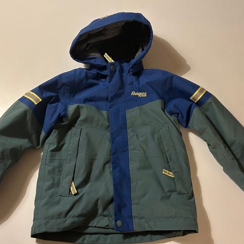 Bergans barnejakke i størrelse 110, Den er laget for å gi varme og beskyttelse til barn. Jakken viser noen tegn på bruk, inkludert mindre slitasje på enkelte områder. NB! Glidelås er ødelagt og må byttes.