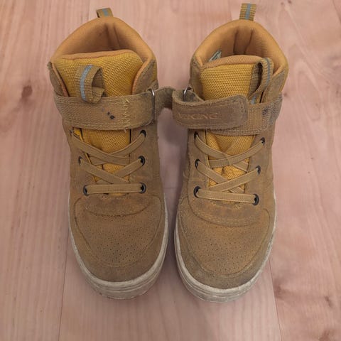 Viking barnesko tur sko i størrelse 32, designet for unisex bruk. Skoene har en kombinasjon av sort og rosa farge, med solide såler som gir godt grep. Materialet er gore-tex til å være slitesterkt og egnet for aktiv bruk.