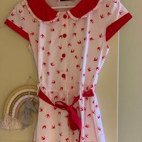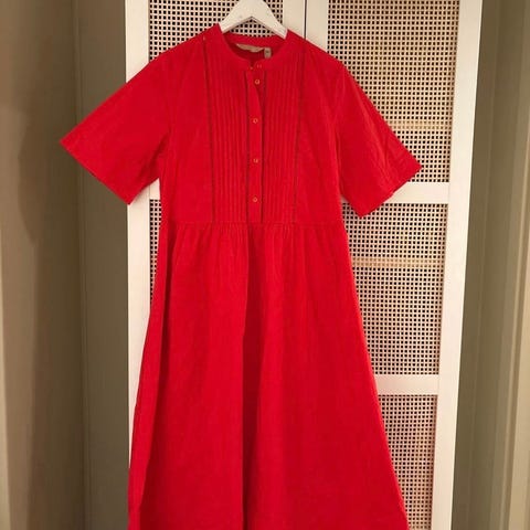 Rød vintagekjole fra Nicole. Deilig kvalitet med 40%viscose. Lommer i sidene. Legg i livet og på skuldre. Knappestol foran, og en knapp nederst på ermet, som avslutter en nydelig v-fold. Stor krage med blondekrage over.