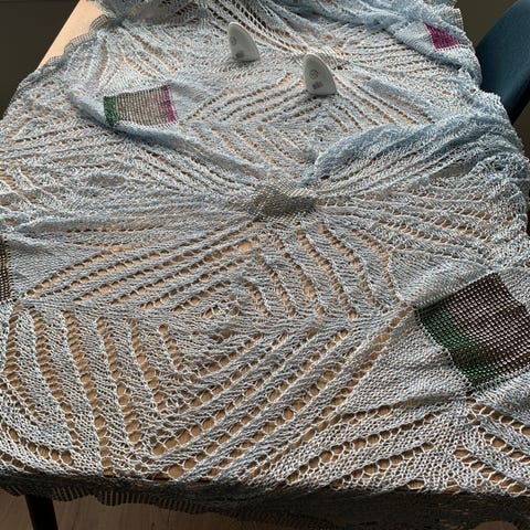 Håndstrikket dusjluffa. Den har en veldig myk og smertefri tekstur.