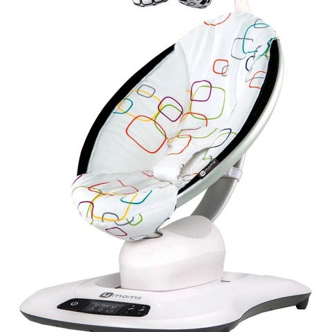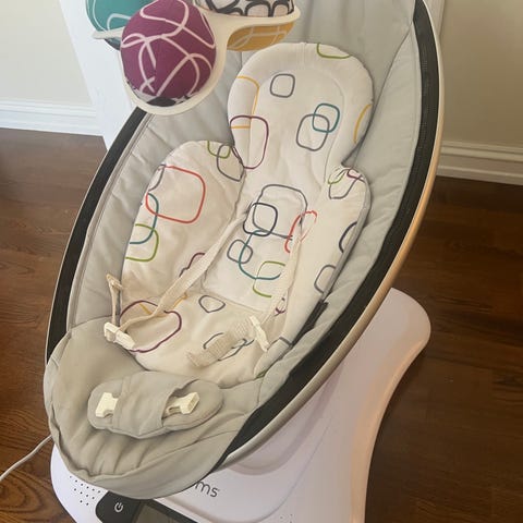 4moms MamaRoo barnestol i svart farge. Laget av tekstilmateriale med elektriske funksjoner for bevegelse. Designet for barn, med sikkerhetssele og justerbar posisjon.