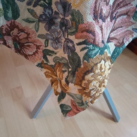 Marimekko tekstilduk med mønster av store blomster i blått og rosa på hvit bakgrunn. Passer til bruk som bordduk eller dekorativ tekstil. Materialet er ikke spesifisert, men stoffet er lett og tøyelig.