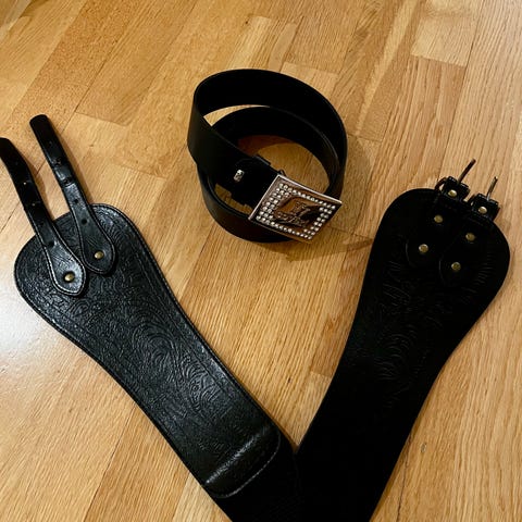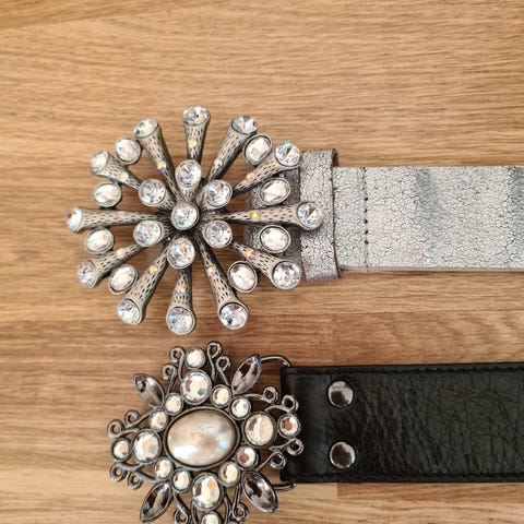 To junior skinnbelter fra POMPdeLUX. Beltene har samme design, men ett er svart og ett er sennepsgult (?).
