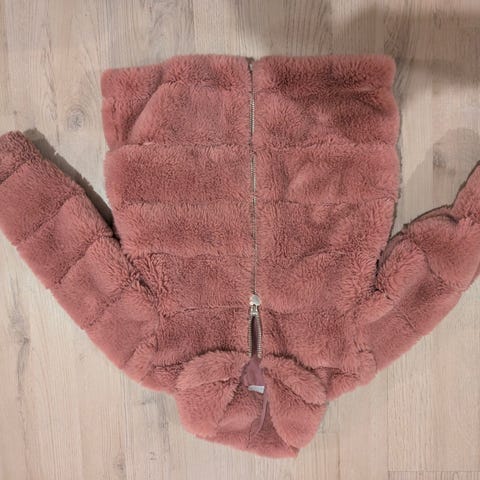 H&M Barnejakke i størrelse 110, unisex design. Jakken er rosa med lilla detaljer og laget av mykt fleece-materiale. Passer til barn og gir god varme og komfort.