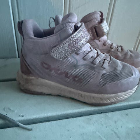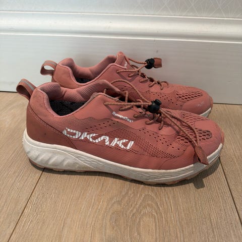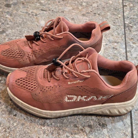 Brukt Okaki sympatex overgangsko str 38. Gammelrosa og hvite. Noe bruksspor, men mye sko igjen. Kun brukt en sesong av ett barn.