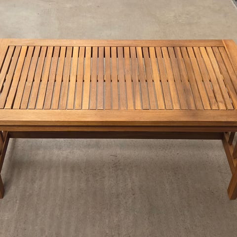Selger hagemøbler fra IKEA på grunn av flytting. De er i god stand, men trenger nok et nytt strøk med beis. Den ene stolen har noen merker, men de tror jeg lett kan pusses bort. Puter til stolene medfølger.