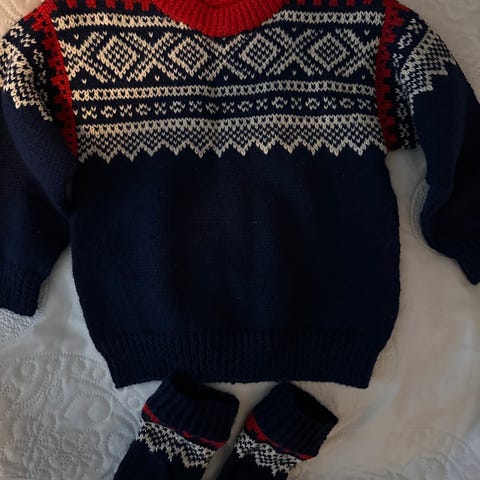 Hjemmestrikket Marius Genser. Usikker på størrelse men mener den har vært brukt mellom 4-6 år.