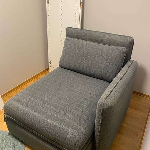 Helt genial stol fra IKEA som enkelt gjøres om til gjesteseng. Ingen hull eller feil på hverken seng, madrass eller trekk.