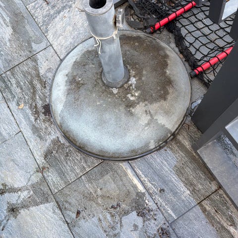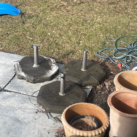 Ukjent merke metallparaplystativ med fire armer for stabilitet. Stativet er laget av metall med et rørlignende senter og har to justeringsskruer for montering eller tilpasning. Fargen er mørk, og stativet egner seg til bruk utendørs for å holde paraplyer eller lignende.