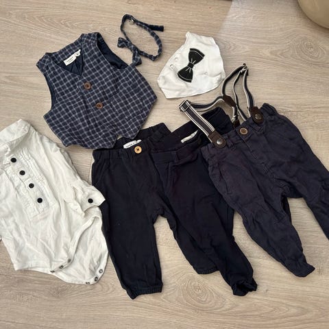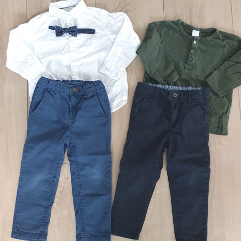 To bukser, en svart og en blå, hvit skjorte og hvit genser med sløyfe og falske bukseseler. Pent brukt, men sløyfa er litt slitt. Alt fra H&M i størrelse 86.