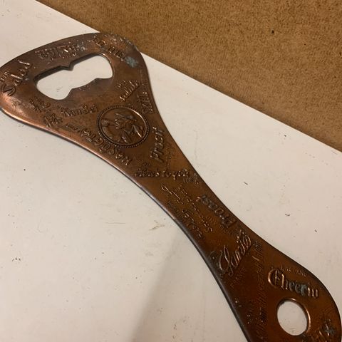 Flaskeåpneren har detaljerte utskjæringer og gullfarget snor for oppheng.