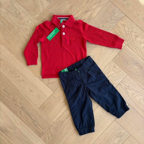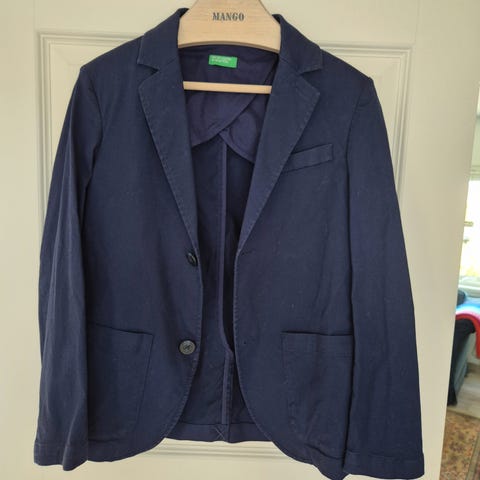 Meget pen Benetton blazer og rutete skjorte i størrelse XS’ 4-5 år. Blazeren har to knapper og lommer foran. Skjorten er rutete blå og hvit med knappelukking og krage.
