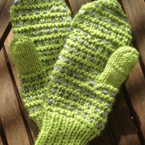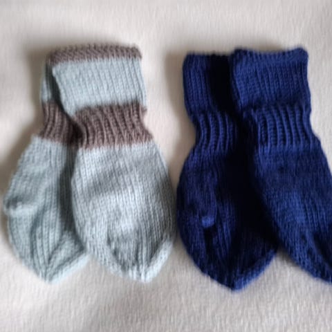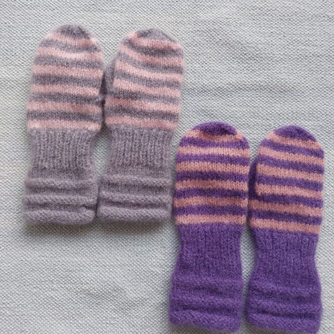 Barnehagevottene er strikket i ull og er I str. 1-2 år .