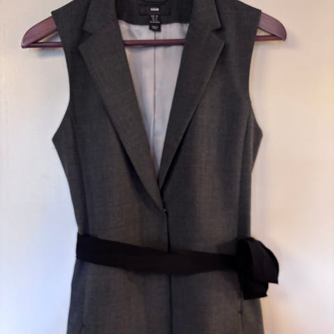 Grå klassisk vest fra Vero Moda i størrelse 38. Normal i størrelsen. Helforet med mange pene skredderdetaljer, som forseggjorte lommer og innsving i livet. Fremstår som et stilig plagg i god kvalitet. Perfekt for jobb, fin med både t-skjorte, bluse og skjorte.
