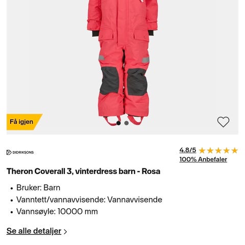 Didriksons Theron Kids Coverall 3 er en oppdatert versjon av Best i Test i Foreldre & Barn fra 2013 og 2014, som kun selges i XXL. Denne modellen har de samme kvalitetene og tekniske løsningene som testvinneren Didriksons Bjørnen parkdress. I tillegg har den større refleks-løsninger og flere lommer.