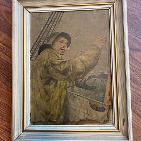 Ghima Rembrandt van Rijn Maleri Ragazza con Scopa, motiv av en ung jente med kost, innrammet kunstverk. Reproduksjon av originalmaleri, inkludert etikett med informasjon om kunstner og verk. Ramme i tre med tekstil kant rundt bildet.