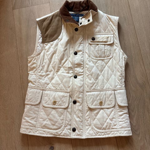 Damemodell i str 34, beige med foret er i marineblåt. Meget elegant vest.