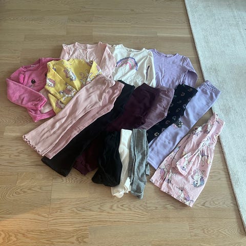 Her er det utrolige mye pent brukte klær, tar derfor ikke bilde av alle produkter. Her er det klær for ulike sesonger som kjoler, tights, gensere, natttøy, jeans, morgenkåpe med mer.