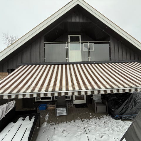 Markise med beige stripete stoff. Inkluderer monteringsutstyr og beslag. Stoff og ramme er synlig brukt men i god stand.