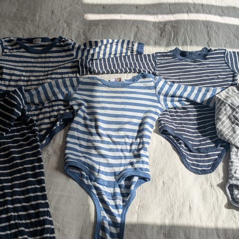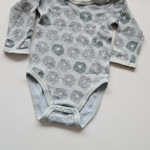 Langermet ullbody. Str. 68. Den blå bodyen er litt flekkete (se bilde). Kommer fra et kjæledyrfritt og røykfritt hjem. Vaskemiddel brukt: Sonett