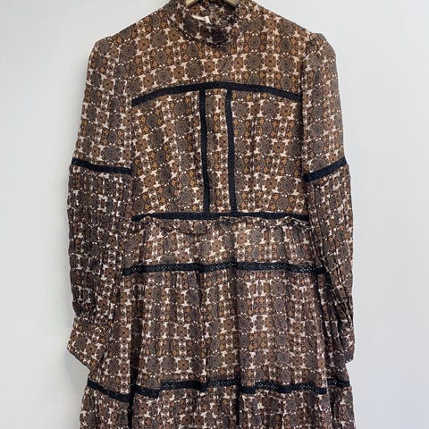 By Malina Hverdagskjole i størrelse XS, brun farge. Kjolen har et mønstret design med svarte detaljer og er laget for kvinner. Passer til hverdagsbruk.
