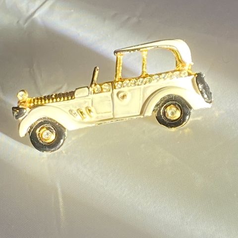 Brosje formet som en klassisk bil med blinkende strassteiner og sorte detaljer