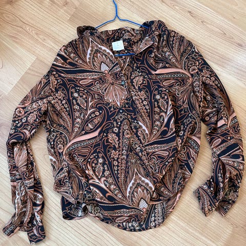 Søkeord: Marc Louge, paisley bluse, mønstret bluse, brun viskosebluse, italiensk design, høstbluse, langermet bluse, boho stil, myk viskose, pen bluse