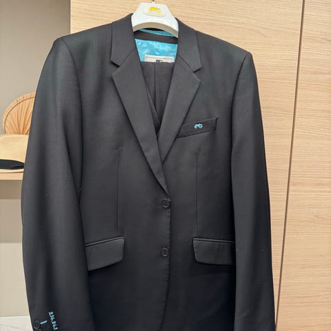 Moods of Norway dressjakke i svart farge, størrelse 46 for herre. Jakken har en klassisk design med to knapper foran og flere innerlommer. Den er foret med turkisblått materiale og har detaljer i rosa.