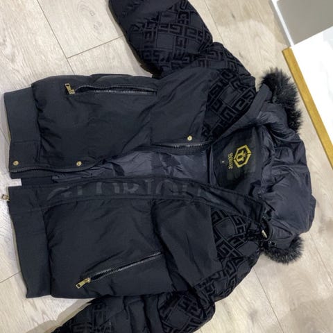 God, varm og kul vinterjakke. Avtagbar hette med «pels». Litt slitasje nederst på trykk på høyre arm (se bilde). Glidelåsene på lommene foran har gått litt opp i sømmen, men påvirker ikke lommene (se bilde).