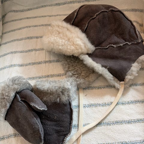 God gammeldags saueskinnslue. Båndene til knyting er ikke helt like da de er byttet ut. God og varm.