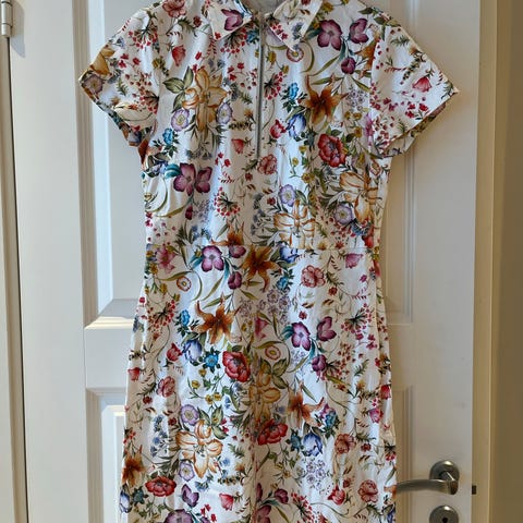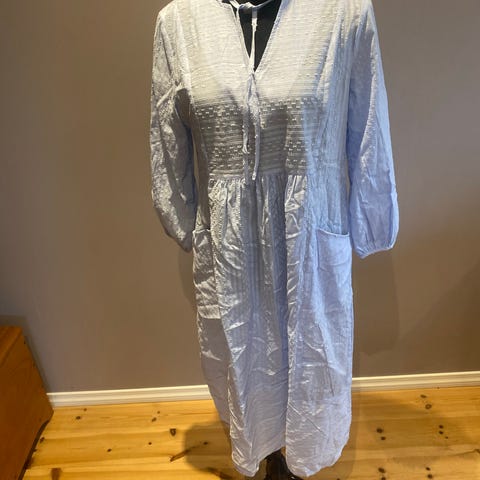 Reserved sommerkjole i blå farge, størrelse M. Kjolen har lange ermer med volangdetaljer og en løs passform. Den har en rund hals foran og en V-utringning bak med knyting. Materialet fremstår som lett og egnet for sommerbruk.100 % viskose, så materialet er veldig fint. 1 blonde var ødelagt, men jeg sydde den på. Jeg tror den er riktig og passer til størrelse L.
