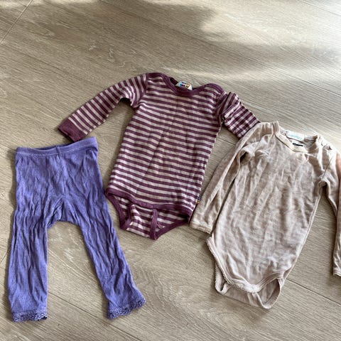 Klær fra PompDeLux, i størrelse 80. Klærne er pent brukt, ingen hull eller flekker. Er noen tråder som stikker ut, som kan klippes vekk. Litt slitasje på innside armer, se siste bilde.