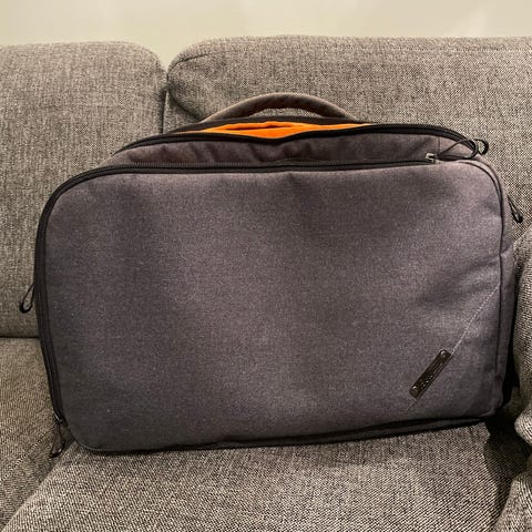 Det finnes pc-rom, flere glidelåslommer, samt dress-/kjolepose med kleshenger i bagen.