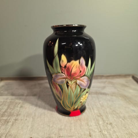 Vintage orientalsk svart blomstervase, flat oval form, laget i Japan