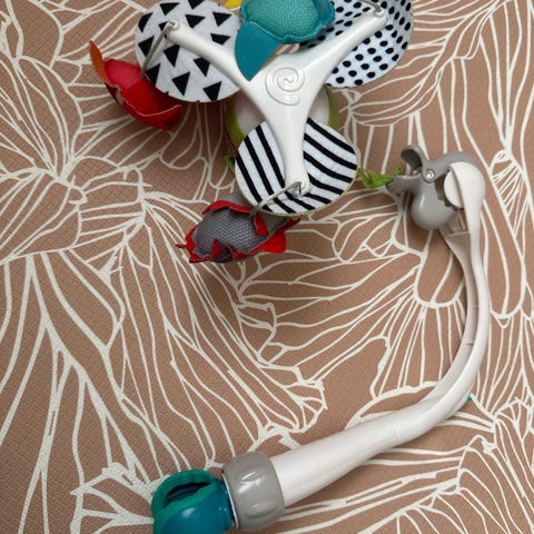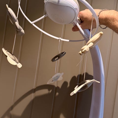 Fisher-Price uro med hvit plastarm og hengende skyer med fargerike dråpeformede elementer. Uroen har lyd- og behagelig lysfunkjson, og lekene snurrer rundt🌙💧