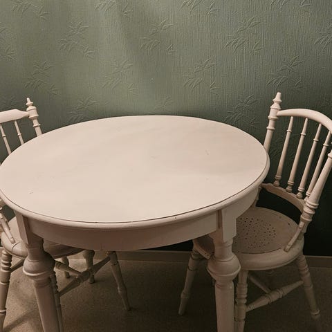 Enkel rokokko stil av bord og 4 stoler. Pent brukt med noen små vanlige bruksmerker. Ukjent hvor gammelt det er. Stått hos besteforeldre. Kan selges separat om ønskelig.